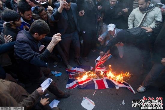 11月29日,在伊朗首都德黑兰,示威者冲进英国驻伊大使馆扯下并焚烧英国国旗。伊朗首都德黑兰数千名高校学生和群众29日下午在英国驻伊朗大使馆门前举行示威活动,抗议英国政府近期对伊朗采取单边制裁措施。示威者向使馆大楼投掷石块,并翻过使馆大门进入大楼,扯下英国国旗焚烧并换上伊朗国旗。