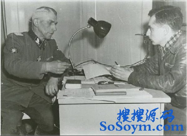 • 这是45年3月,被俘的51岁的约翰.戈贝尔党卫军上校(身着山地炮兵军服)正在接受美第三军一个上尉的问讯