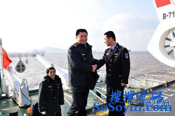 中国海监50”号首航任务指挥员郭懿忠(右一)欢迎中国海监东海总队指挥处处长周和建(中)、中国海监东海总队装备技术处副处长张小荣(左)上船进行航前最后检查。